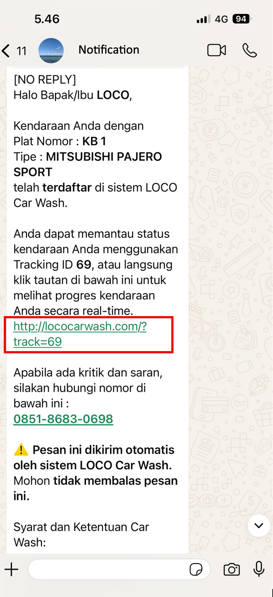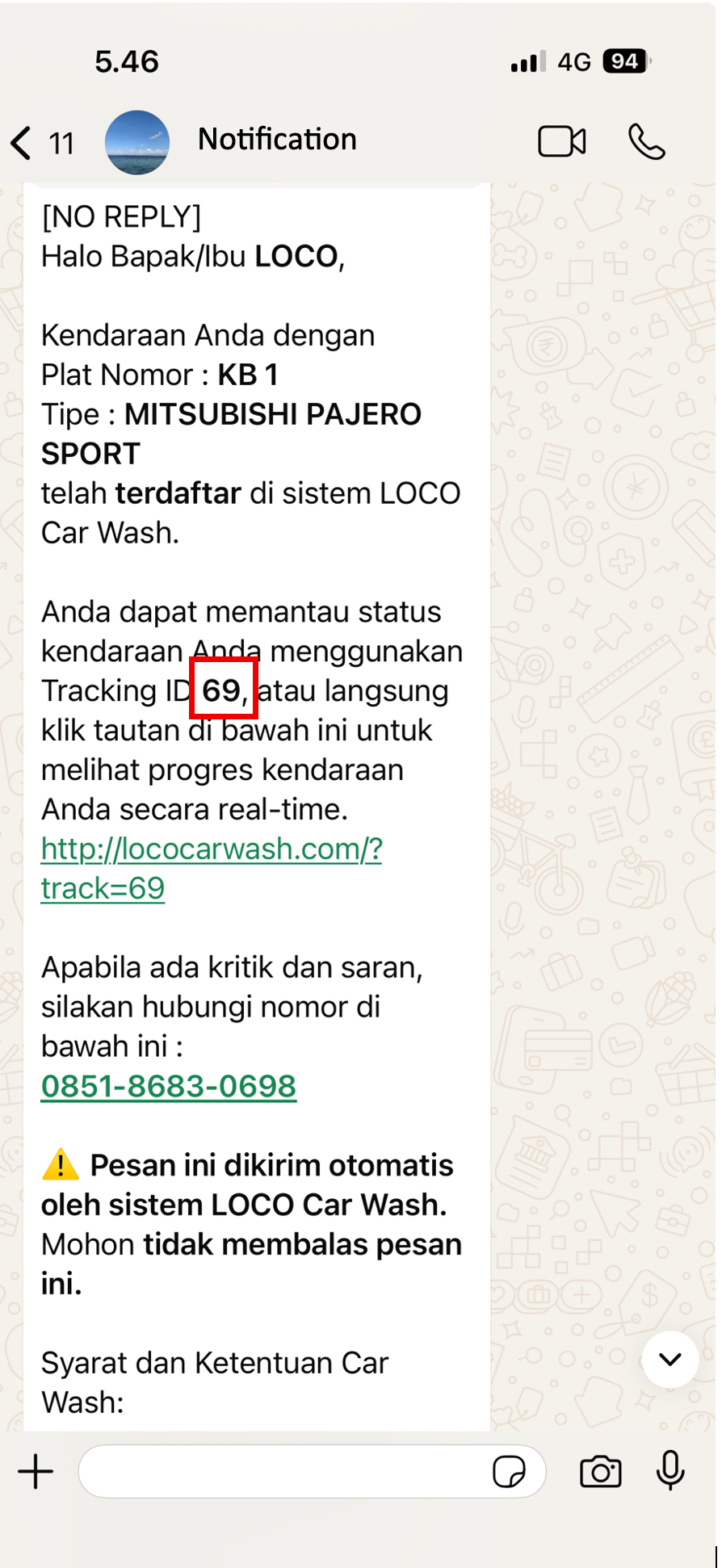 Setelah kendaraan Anda terdaftar di sistem LOCO Car Wash, Anda akan menerima pesan WhatsApp otomatis berisi Tracking ID dan link tracking.